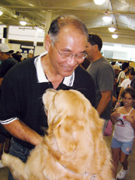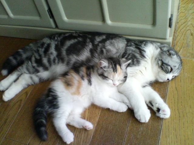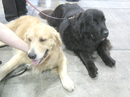 Cちゃんのペッチョ・エキスポでびゅー。ぐれぎょりあんのゲーのおともらち(あり?)のらりーさんが「ぬーふぁんらんど」ちゅーCちゃんを2周りくらいデカくして真っ黒にしたような犬を飼っちょる。この日は日本人のボーイふりぇんどと一日「ぬーふぁんらんどブース」におりゅっちゅーのでご対面しにいったがや。 この子がぬーふぁんらんどの『マナ』ちゃん。130パウンドありゅ。わしより重いなんてちょっとうっとり。。こうやってCちゃんと並ぶとCちゃんより大きいのがあんまりわからんがな。。(Cちゃんデブ。。) Cちゃんの育ての親ブリーダーのおとうちゃんが別のブースにいてて、感激のご対面だら。たまにバッタリ会うことがあるけど、Cちゃんはその度、大興奮。小さい頃の恩を忘れてないんじゃのー。いつものように「ウエストないよ。ダイエットさせてね」とキビシイお言葉をいただく。。 この子はウィンちゃん。いかにも『ショードック』ちゅー名前だら?Cちゃんかとおもうほどそっくし。。それもそのはず、話してたらCちゃんのハーフブラザーだったがや。やっぺちCちゃんのおかあちゃんの子は可愛いのぉ、、(ただの親ばか?) 《今日のコネコ》 もじょさんちの新しいコネコ。。兄弟仲良しだら?毛並みも若くてちれいね。。 |