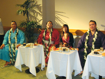 いきなりスーピャーサイズのアップとともにおひさしブリだら?写真はマジメに撮ってたけろ、忙しくてネットから失踪してたがや。。皆さめご無沙汰してまちた。。あまりに写真がたまり過ぎていったい時世はどこに飛ぶ。。ちゅ−感じじゃが、しばらく古い話に戻るけろ勘弁してちょー。 こりはわしが5月にヒーコラせごとしてた『まちゅりin Hawaii』ちゅー、きんてちゅが主催して毎年やっちょるイベンチョのオープニングパーチの模様。 太鼓や、津軽三味線や、フラ婆や、おばちゃん版竹の子族や大道芸人まで日本各地からいろんなお祭り野郎が来て、ハワイのお祭り野郎と合流するそれはそれは、すごいイベンチョ。感動するのもあれば、見てて『かぁ〜』ってこっちが照れるのもありゅけろ、参加した人も観てる人も皆楽しそうじゃで、終りよければ全てヨシってことになりゅ。 この同じ時期にハワイ場所もあって、ワイケケのあちこちでマゲ結ったお相撲さんが浴衣で闊歩しちょったのがええ感じじゃっただら。格闘技ファンのスーピャーサイズに促されてついミーハーにもお相撲さんとかと写真撮ってもろたで、アップしゅる。もう名前忘れたけろ、高見なんとかと、峰なんとかやったかの?若い方のお相撲さんがなかなかイケメンじゃったで。皆名前知ってたら教えてちょ。わしは朝潮とか千代の富士の時代からすっかり相撲はわきゃらんでな。 《今日のおまけ》 ネギを切ったあとの根の部分をオミズにつけといたら、あっと言う間にまた生えてきておもちろいように伸びる。ネギ買わんでもうどんくらいには使えるで。皆もやってみて。 |