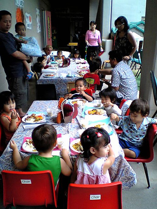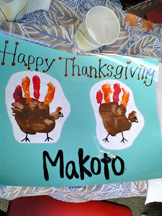 小玉のぎゃっこうはワイチチのド真中にあるさけ、いろんな働く父ちゃん、母ちゃんがころもを預けにくりゅ。インド人ありーの、中国人ありーの、フィリピーノありーの、韓国人ありーの、白人やら、ローカルやら、えろんな民族がおってそれは万博のような賑わい。日本人が一番多いけろな。 小さなころも達のテーブルにはちゃんと手作りのテーブルマットにターキーの飾り付けがしてあって、ころも達の皿にも1チョ前にターキーやらグレービーやらマッシュポテチやら、温野菜がのっちょる。。こうやってアメリケンになっていくんじゃの。わしはズニアの代わりに出席。まるでゲーのきゃっぷるの様に小玉を囲んでランチだら。わしはころもがおらんのでこげな経験させてもらうのが楽しいがや。サンクスぎびんぎゅの前からしっかとターキーをいただいて帰りゅ。ごちゃま。 帰りに小玉に「ぷ〜ちゃん、ほしーのぉ〜」とゴネられて嬉しい困ったチャンじゃったが、きゃわええ日本人のりちゃこてんていのとこに連れてったらOKじゃった。。若いってすてち。。 《小玉のボーイフリェンドまきょとの手製のまっとby手形》 てんていもよくかんがえりゅのぉ〜。。と感心。 |