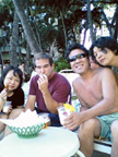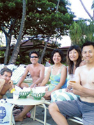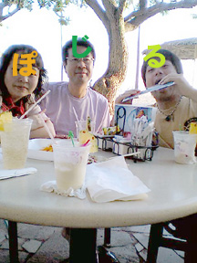 またまたトロピッキュのズニアのライブリポートだら。今日はええ天気じゃったのでビーチサイドのいつものバーでりゃいぶ。ここではたいてい日本からの友達とワイワイやるのが通常だら。日本じゃお盆で皆が来てくれりゅ頃..今日は同じ日にとろ&じじとろ、りゅいくん、ぽにゃぺんさんが同時渡ハ。早速ここであつまりゅ。 一応ぷらいばしーを考えて顔隠してる風じゃがまったく見えてりゅのは、意味ないだら〜?でもせっかくええ顔で撮ったのに隠すのがもったいないだら?(違う?) 後から駆け付け2ひゃーのきゅーやんとつぼっきゅ。りゅいくんは写真とる時まともにしてくれんとこはズニアと一緒だがや。(最初のズニアの写真をきゅりっきゅしたまえ) 皆でサンセットみながらのライブはいつ来てもりらっくしんぎゅ。。。とおもいきや、ライブが終わったらどしゃぶりの雨が。。途中で降って機材が濡れんでよかったのー。8時前になったので皆で一緒にヒルトンの花火を目の前で観て解散。 ほな〜またあちたね。。 ,,,とおもいきや。。わしはまだ食ったでー。第2部じゃでー!バーはちーじーで好きじゃないケロ、唯一よく行く近所のワインバー『Formaggio』だら。 隣のワイン&グルメショップ『Fujioka's』のオーナー(藤岡さん?)が始めた知る人ぞシルワインばー..ちゅーのは表は地味でバーってわからん。しかし、チン曜日でジャズライブもあるとあって結構混んでおった。 ここのPUPUは美味しい。ぐれぎょりあんはビーフの入ったパニーニ。わしはワインだけにしようと思いつつつい「チーズブレッド」ってゆーてしもたがや。。しかしここのチーパンはわしの好きなハイズのチーパンよりおいちいで。固めのバケットに隣のグルメなチーズを乗せて焼いてありゅ。おかげで4つも食べてしもた。 帰ってちゃんとじじとろさんの配慮でぐれぎょりあんにいただいた赤福をでじゃーとに一緒にたべりゅ。今日も一日口酸性。。。 明日はさーひんいきゅで! |