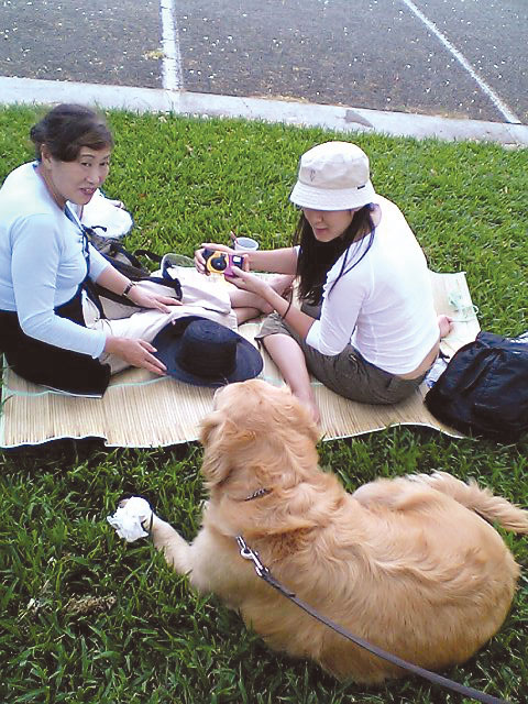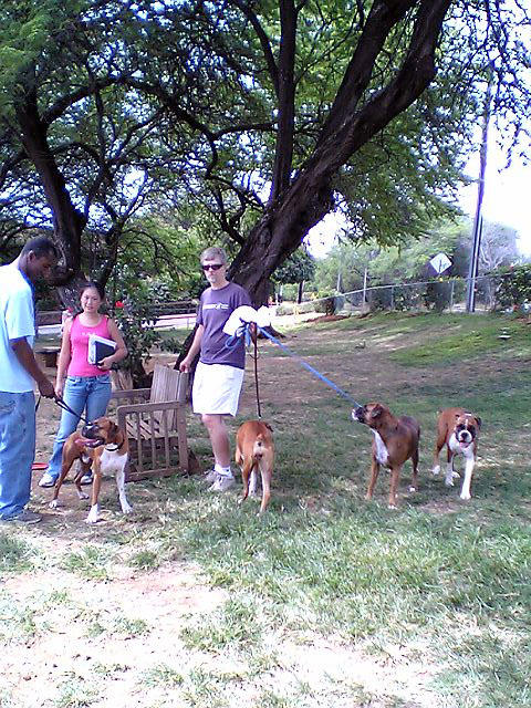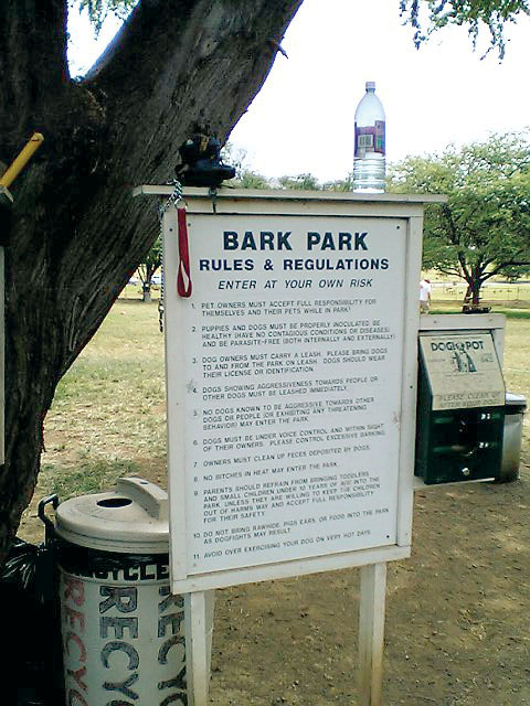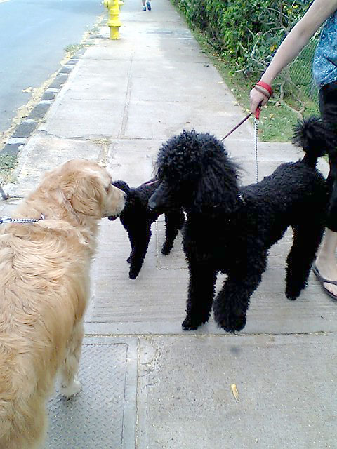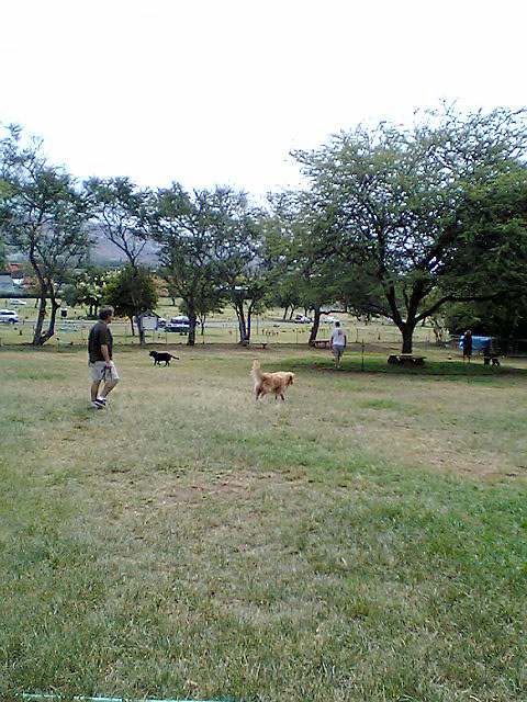 今度はダイヤモンドヘッド入り口のはす向かいにあるBARK PARKです。 こりは日本で言う『ドッグラン』ちゅーの? 他のワンコと一緒に放し飼いで遊べる公園。スプリンクラーやら水飲み場やらテニスボールやらフリスビーやら犬の好きそうなものが用意されてて、専用(?)○コバッグもあるんじゃ。 ほれほれ..きゃわええ、おともらちも来たで。。大きい黒プードルと小さい黒ミニチュアプードルちゃん。 しかし、中に入るといろんな種類の子がいてて、一緒に遊んでる。きゃわええのぉ〜。 さてうちのCちゃんは??..というと、他のお母さんやお父さんのとこ行って撫でてもらったり、ダディにつきっきりで他の子とよう遊ばんねん。。。 おのれは犬じゃぁ〜〜。。犬と遊ばんかい! |