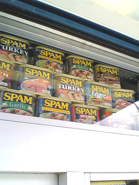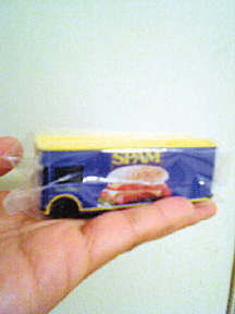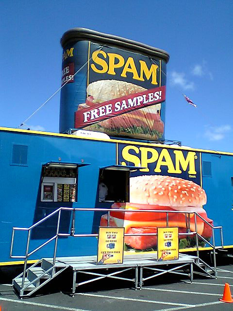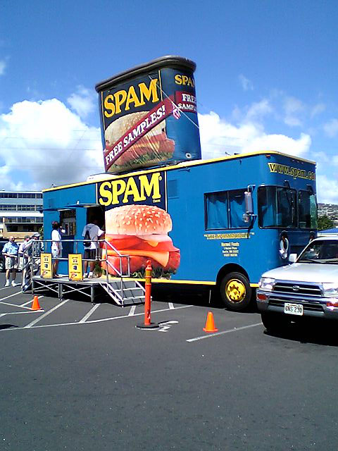 いきなりStar Marketにそそり立つスパム。。 なんとも青い空に映えてとってもキュートなスパムカー! きゃわええお姉ちゃん達がホットパンツで窓から手を振ってる。。 なんなんだろーと遠巻きに,,でもデジカメ.. こんなに種類があったのね。スパムって知ってた?(クリックしてみよう!) オリジナルスパム、減塩スパム、ターキースパム、ホット&スパイシースパム、ハワイスパム、ガーリックスパム、このLegerスパムって何かしら?? ちょっとシャイなわしは、お姉ちゃんの乗ってるスパムカーのウインドウに登って行くのを躊躇したらローカルのおばちゃんが車から降りて来て「クーポンもらえるで!」って教えてくれた..(どこの国でもいるんやな。こういう世話焼きのおばちゃん)スパムバーガーやらを試食できてクーポンをくれるキャンペーンらしい。 とりあえずガーデンショップに寄って、用事を済ませて勇気を振り絞って行こうとしたら。。あらあら..もうお片付け。でも、お姉ちゃんがその辺にいる人に終わりなのでオマケを配ってた。。子供でもないけどもらいに行く。。おお!限定不売品スパム・ミニカー!!! こりは烈火ちゃんに今度おきゅるわな。 PR |